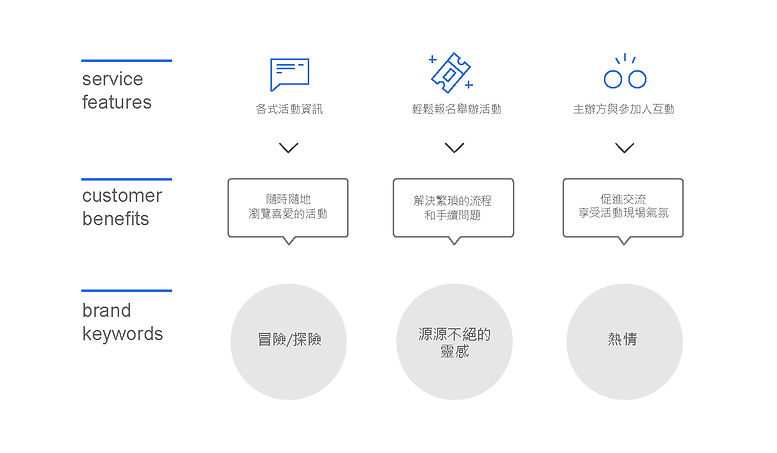 由 Accupass 的核心服務為起點,以關鍵字定位品牌形象和個性,建立品牌識別度,讓主辦方與參加人均能對品牌形象有所共鳴。